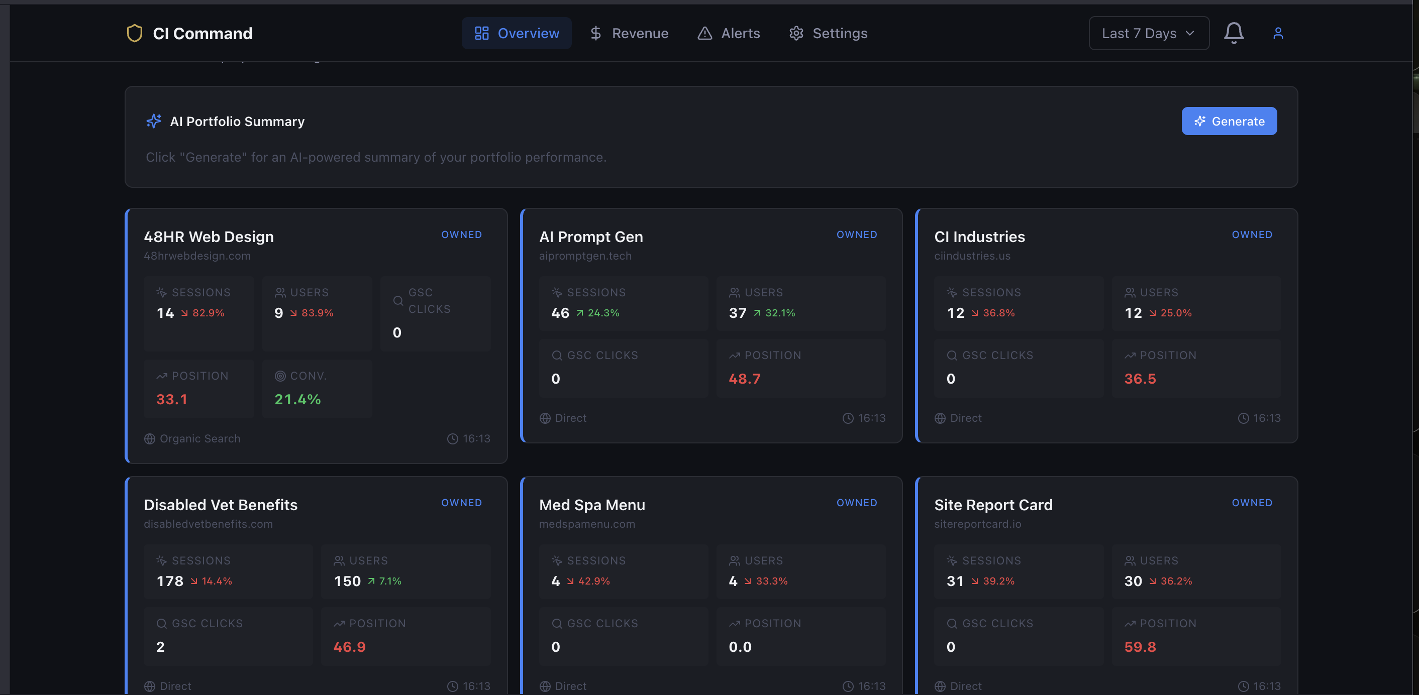 Stop logging into 15 different GA accounts. Command Center unifies GA4, Google Search Console, and Stripe data for all your client properties. AI-generated summaries. Revenue tracking. PDF reports.