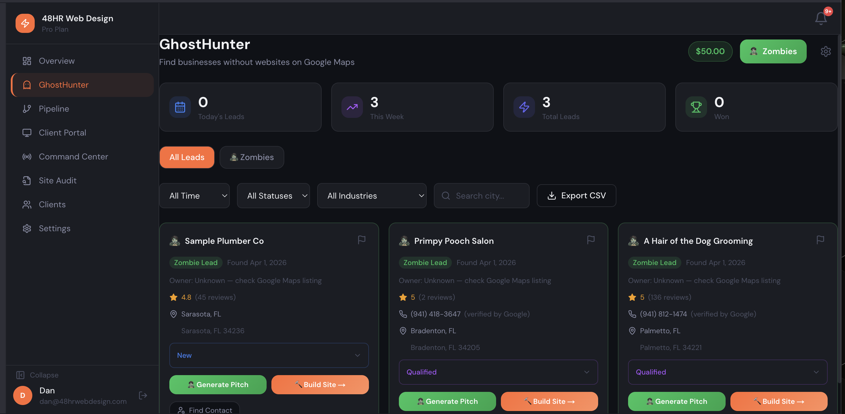 Search any city, any industry. GhostHunter finds businesses listed on Google Maps that have no website linked to their profile.